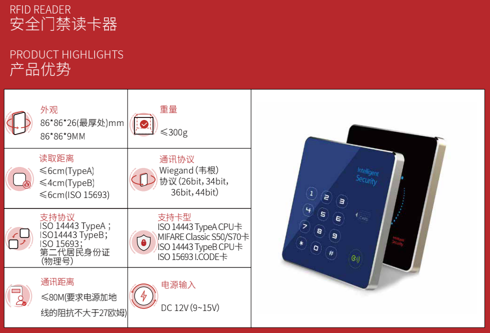 读取国密门禁卡(门禁卡必须是国密卡)。与控制器采用485传输(不能采取wg26/34,无法对数据加密),一般不建议超过80米,布线可采用网线。